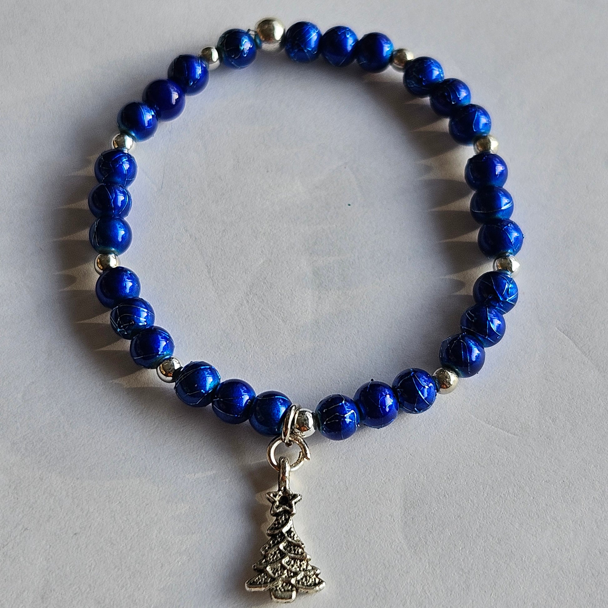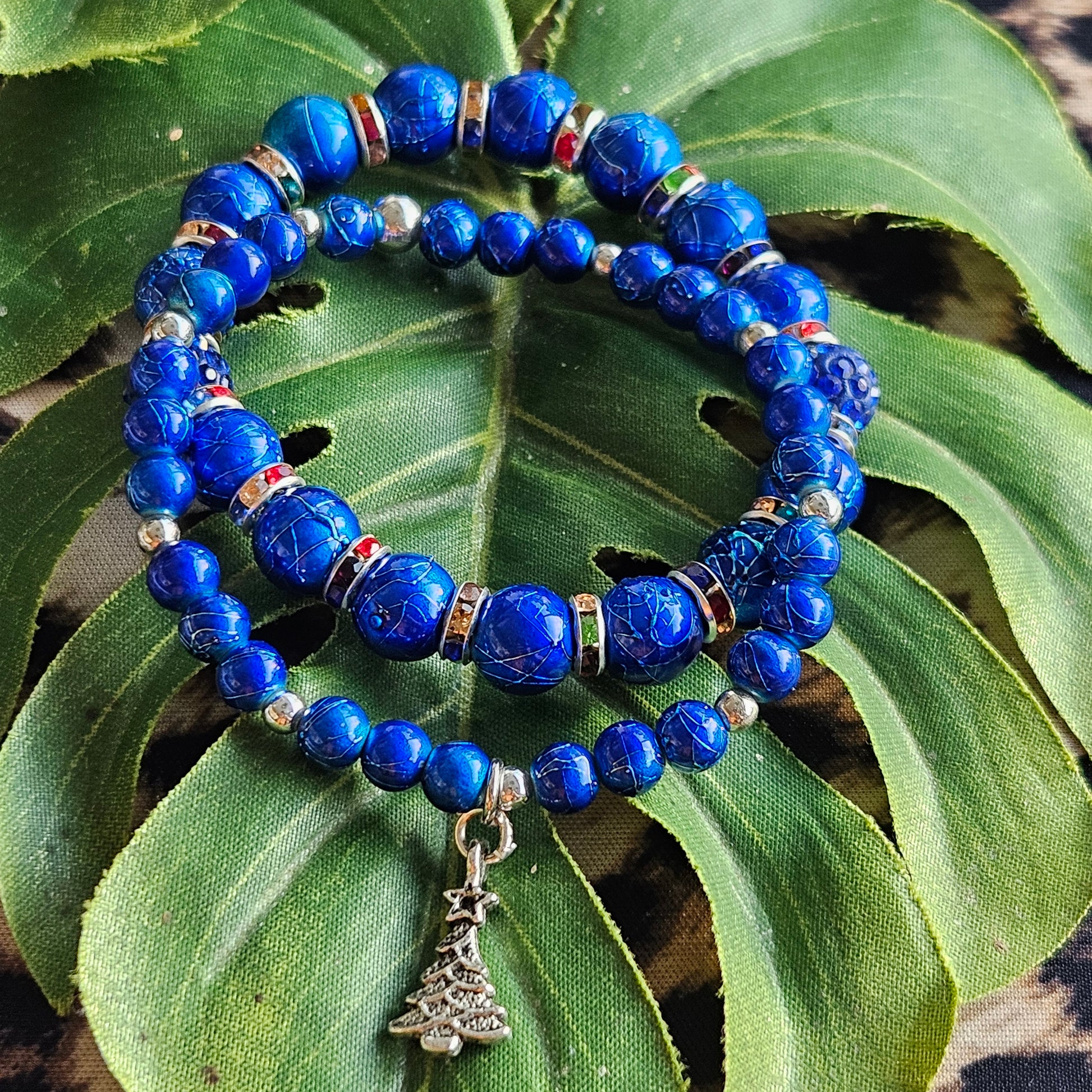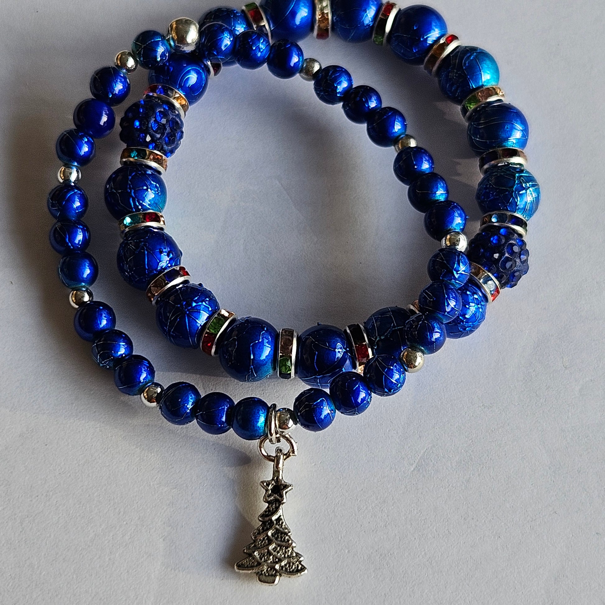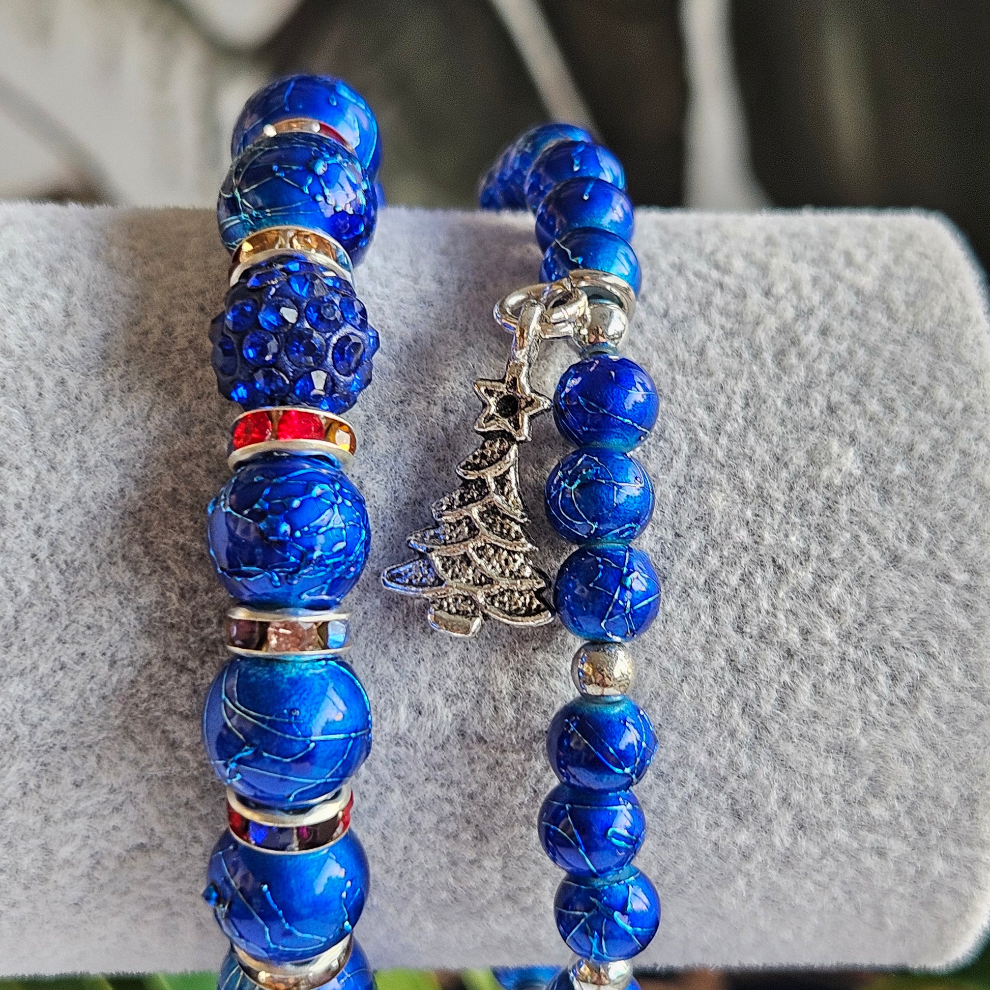 2 Perlenarmbänder Blau Weihnachten mit Anhänger Baum