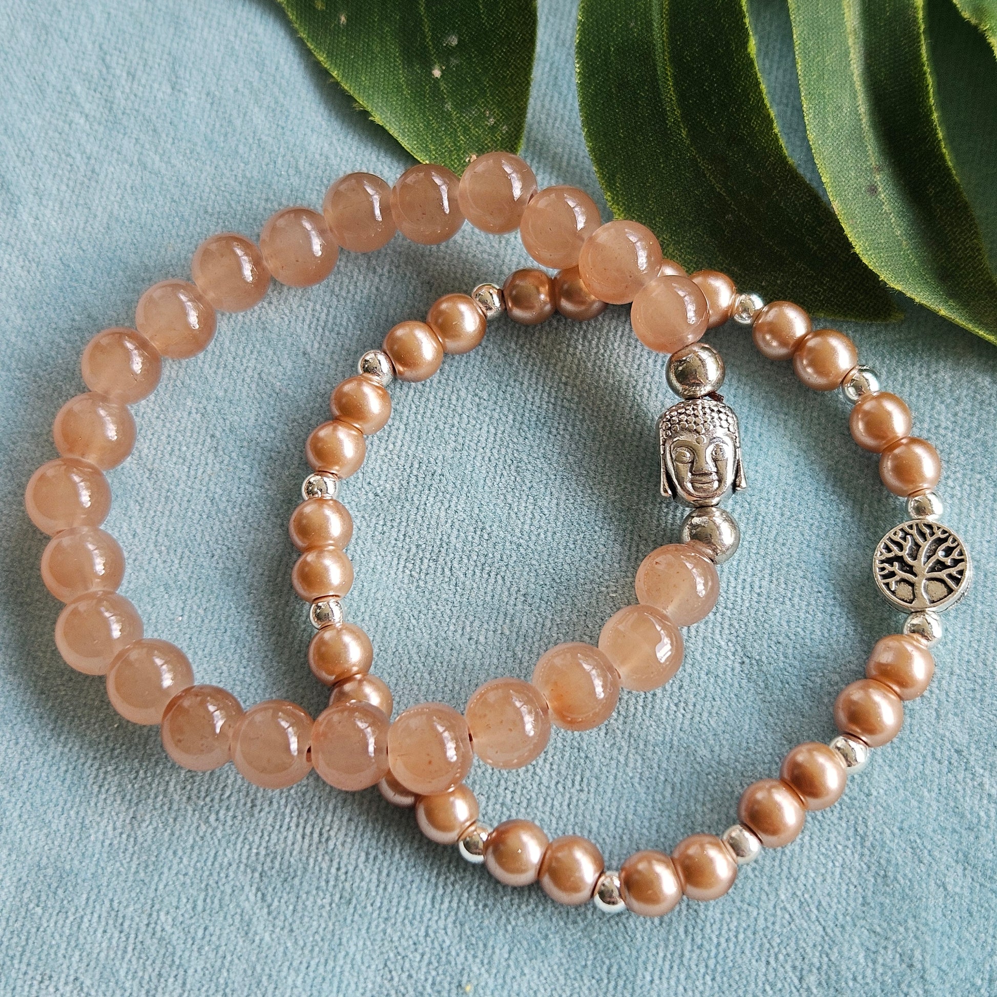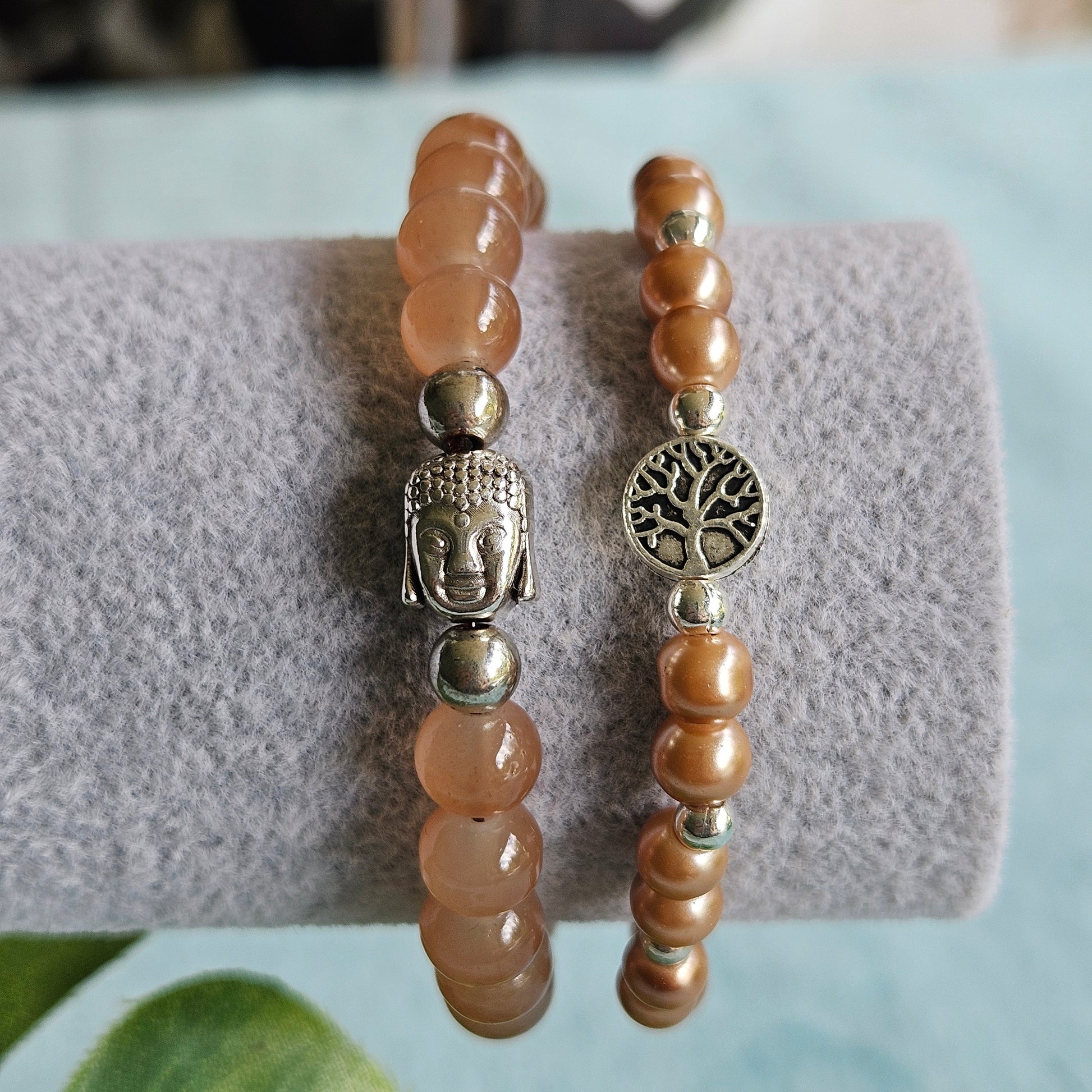 Länge ca. 18 cm, Buddha, Lebensbaum, Wachs-/ Glas-Perlen, Metall silberfarbig.