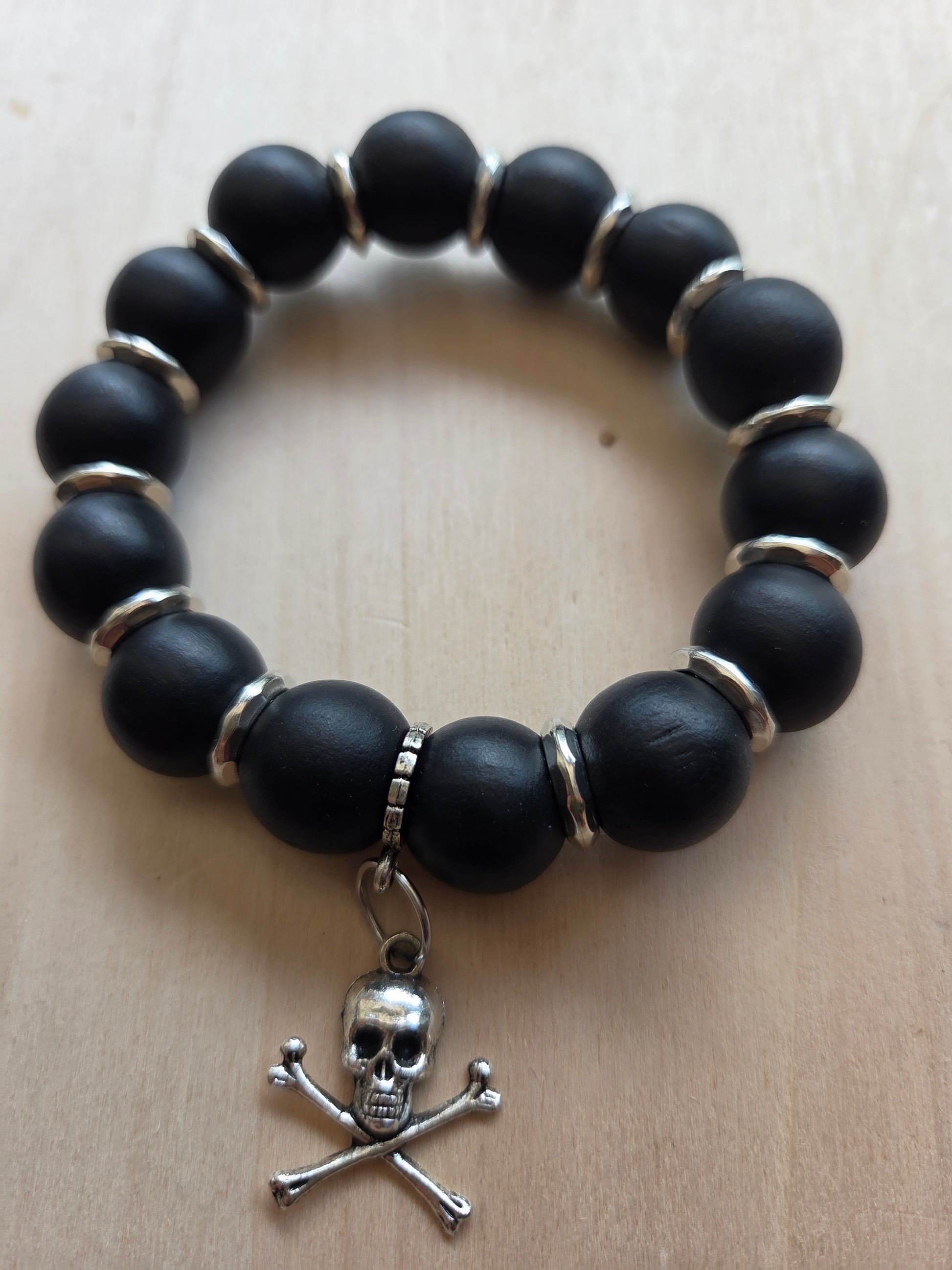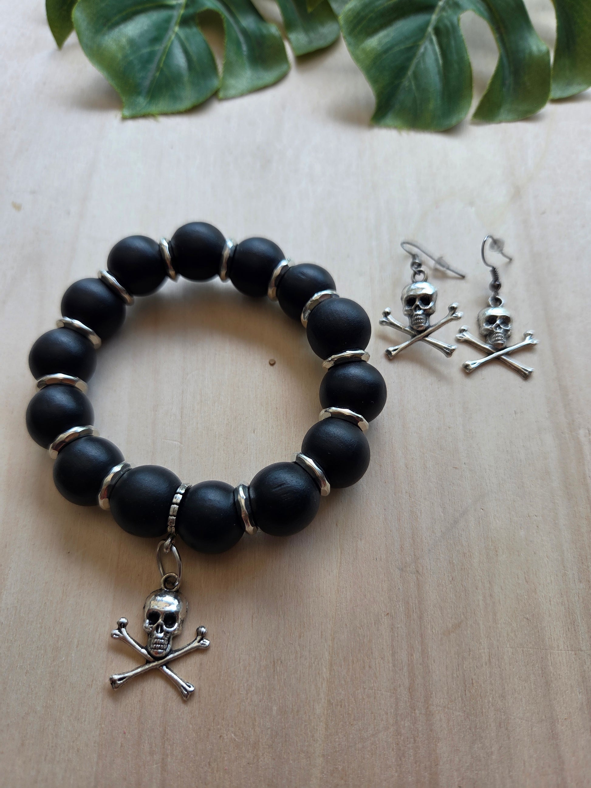 Armbänder Große Perlen schwarz mit Totenkopf und Ohringen