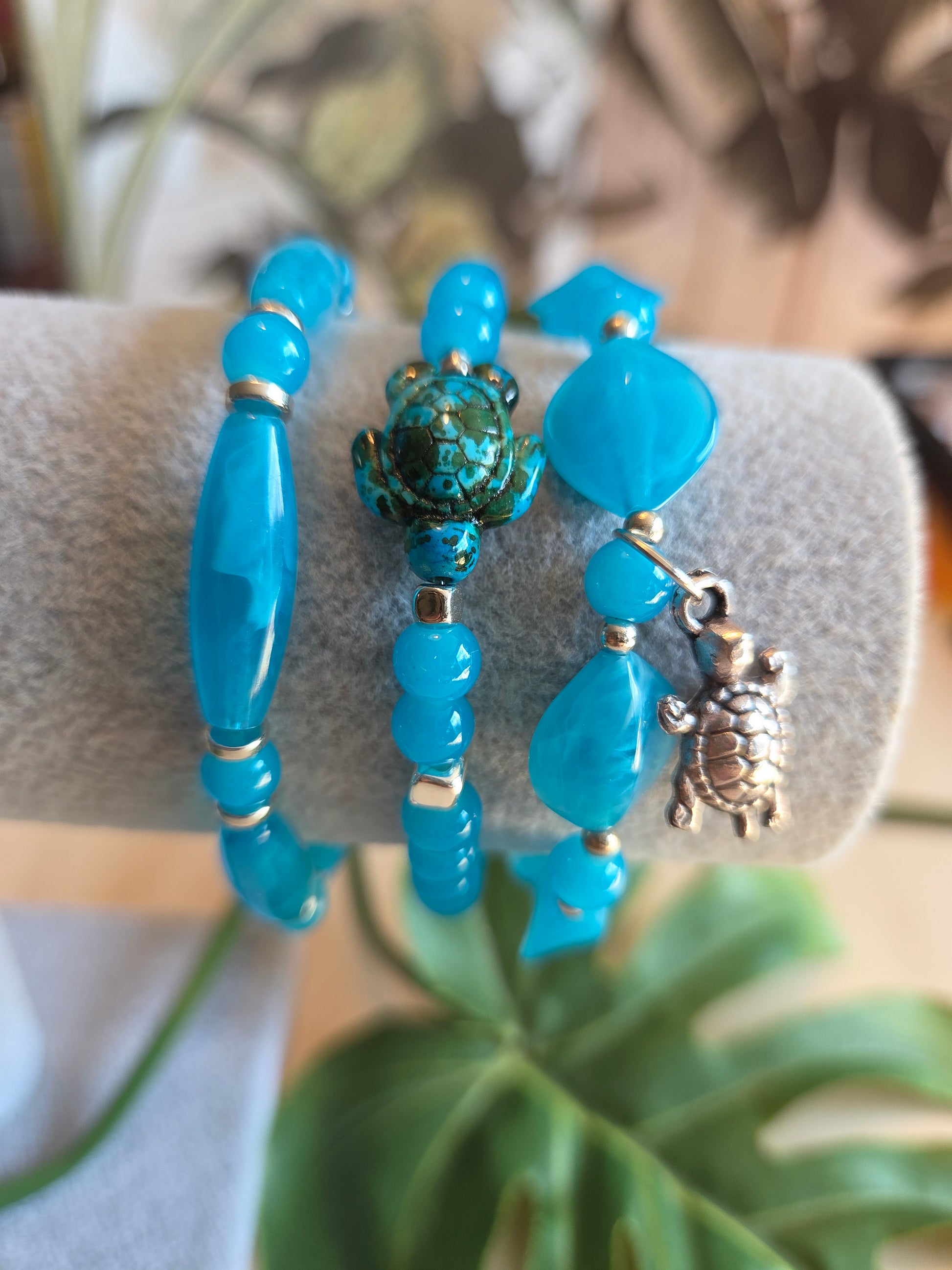 Armbänder Perlen hellblau mit Schildkröten 3 er Set