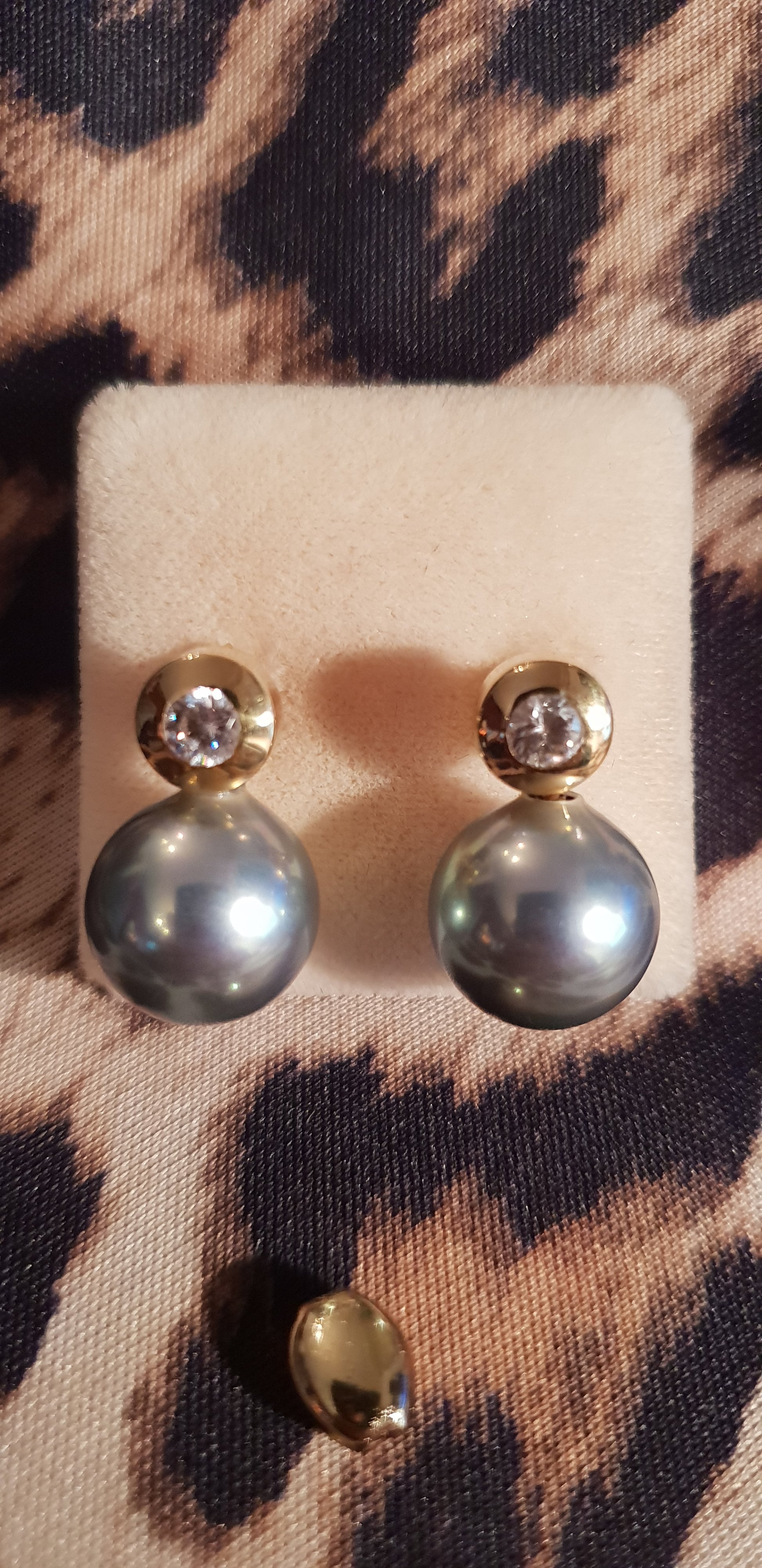 Ohrstecker, echte SOUTH CHINA PEARLS, ca. 12 mm, silbergrau , 985er Sterling Silber, 14 ct vergoldet, Zirkonia.